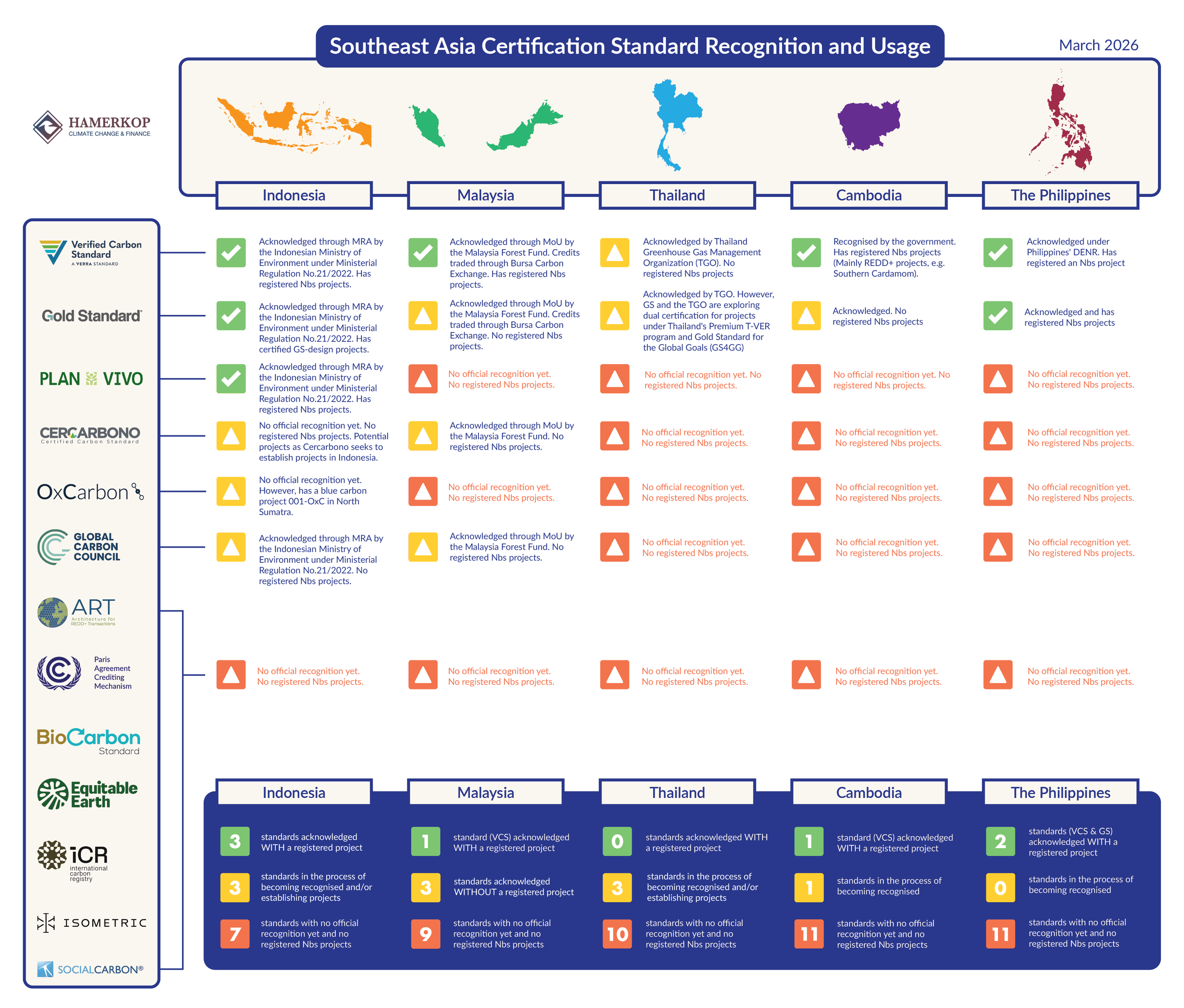 To gain an overall understanding of the landscape of NbS policy/strategies in these countries, we first looked at a country-by-country snapshot (as of September 2025) of how the carbon certification standards are recognized and used for NbS across the five Southeast Asian markets, as seen in the infographic in Figure 1.